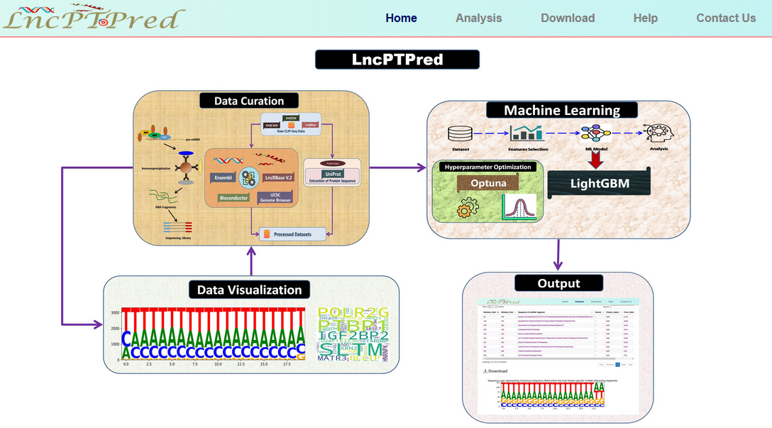 LncPTPred is a Machine Learning based tool trained on crosslinking and immunoprecipitation (CLIP-Seq) data to predict region-specific interactions between long non-coding RNAs (lncRNAs) and proteins.